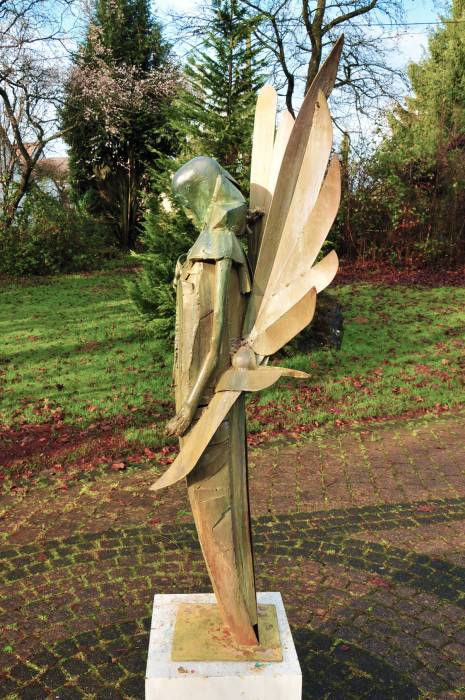 Eine beflügelte Figur in einer stolzen Haltung. Die Skulptur stellt einen schwarzen afrikanischen Engel dar. Einen Phoenix, der aus der Asche seiner Vorfahren aufgestanden ist. Die Wiedergeburt des Individuums ist das zentrale Thema dieses Werkes.